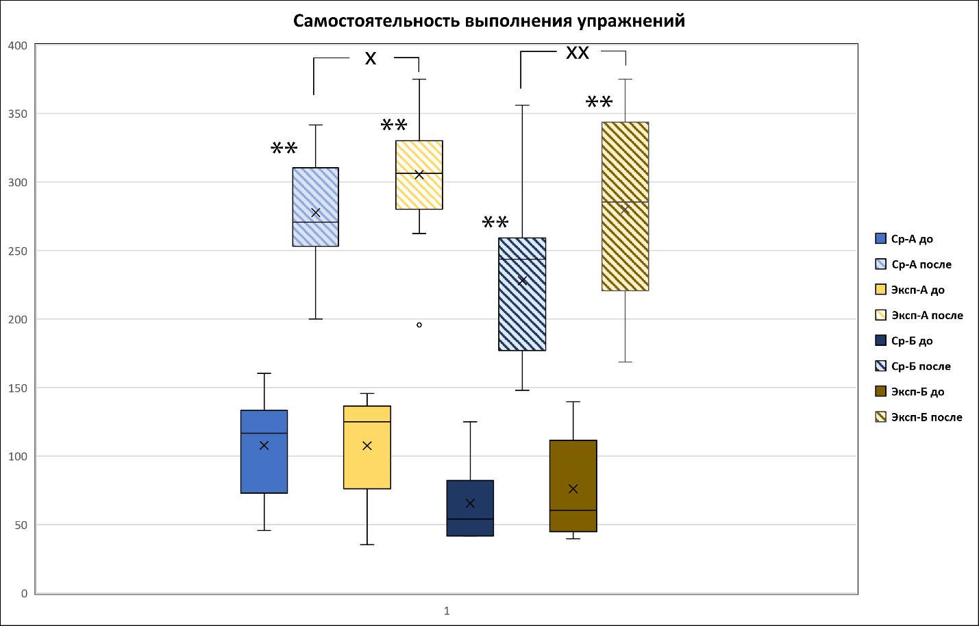 Как и в случае показателя «техника», «самостоятельность выполнения упражнений» достоверно различается у подгрупп А и Б, как для контрольной, так и экспериментальной группы до начала курса, а по окончании курса это характерно только для контрольной группы (см. рис. 4). Уровень самостоятельности в экспериментальных подгруппах достоверно выше, чем в контрольных и сопоставим для подгрупп А и Б. Эти данные свидетельствуют об эффективности программы «Аут Фитнес» в плане развития самостоятельности, особенно заметно это в подгруппе с более низким уровнем функционирования. Улучшение достигается за счет специальных упражнений и системы дозированной помощи в процессе освоения развития навыков на занятиях.