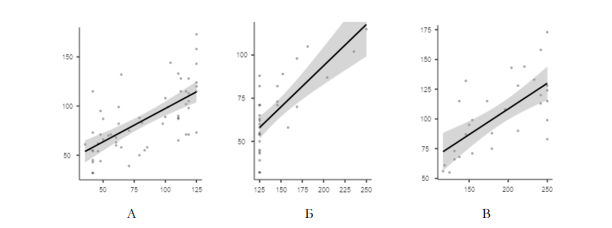 Примечание: По оси Х «понимание инструкций» в суммарных баллах, по оси У – длина прыжка в см. А – до начала занятий (R = 0,670 при р < ,001) (объединенная группа сравнение + эксперимент); Б – после курса занятий (R = 0,742 при р < ,001) (группа сравнения); В – после курса занятий (R = 0,677 при р < ,001) (эксперимент)