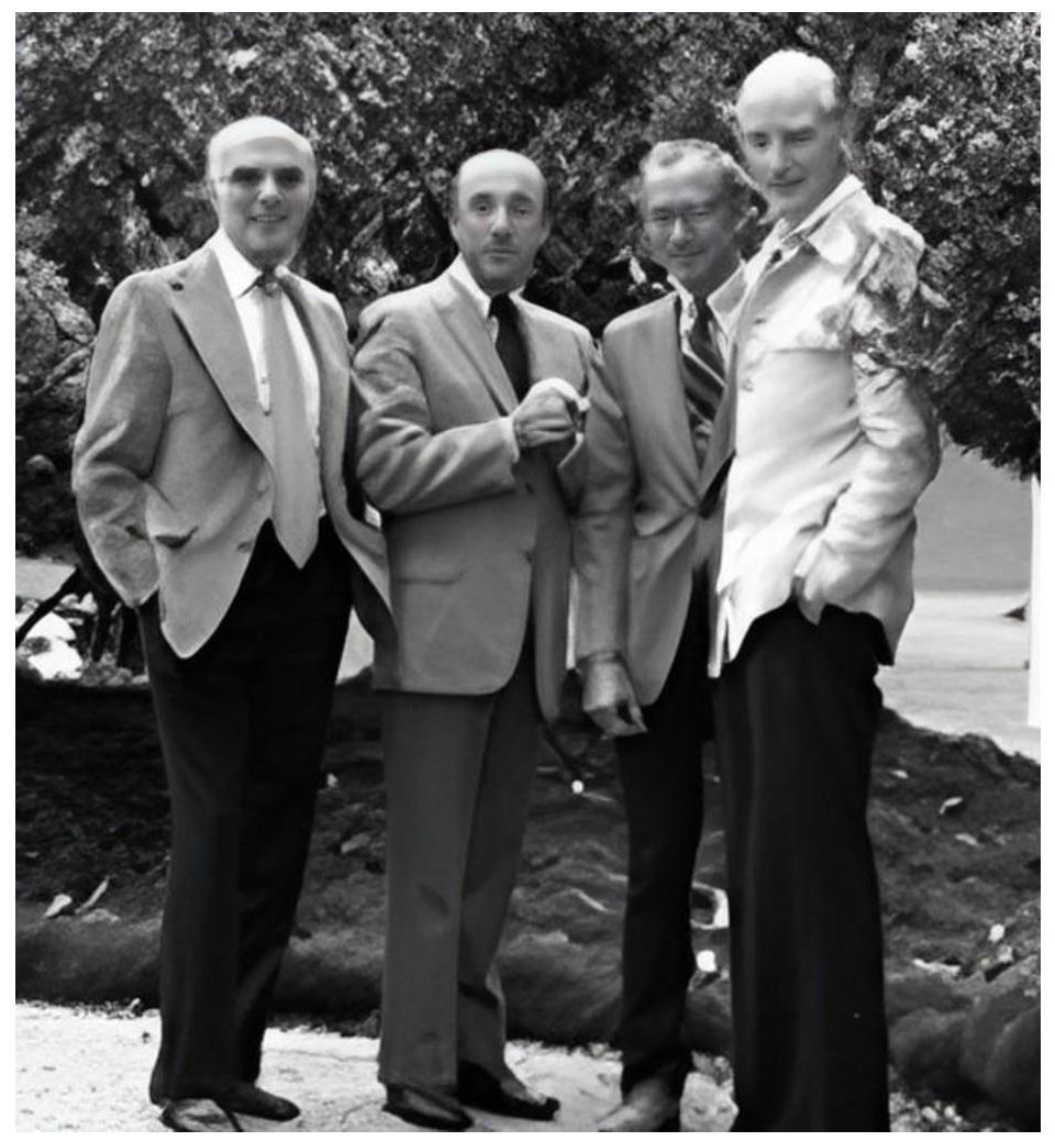 Fig. 3. Four Nobel Prize laureates in physiology or medicine (from left to right; years of award in brackets) at one conference: R. Dulbecco (1975), R. Guillemin (1977), R. Holley (1968) and F. Crick (1962)