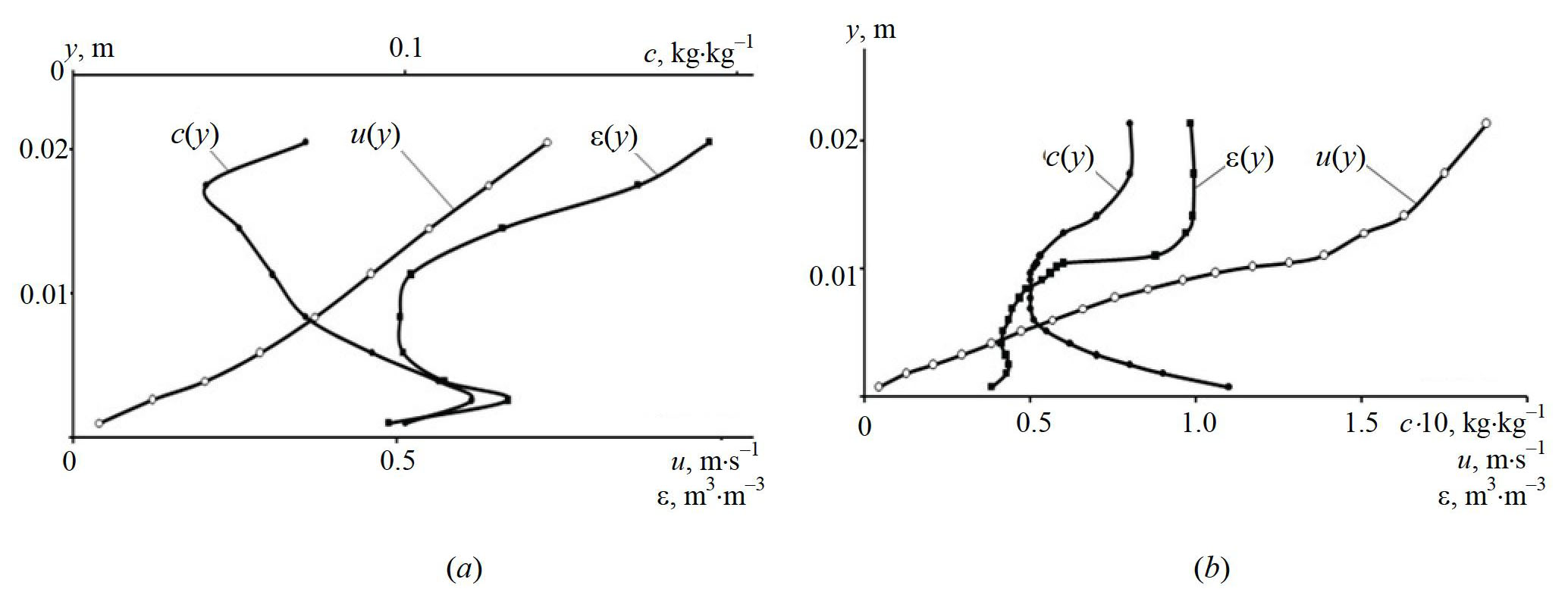 The results of the study in the form of profiles of velocity, volume fraction of voids and concentration of control particles (silica gel) in gravity flows without additional momentum action and in the case of its activation (belt speed 1.5 m×s–1) are shown in Figs. 5a and 5b, respectively.