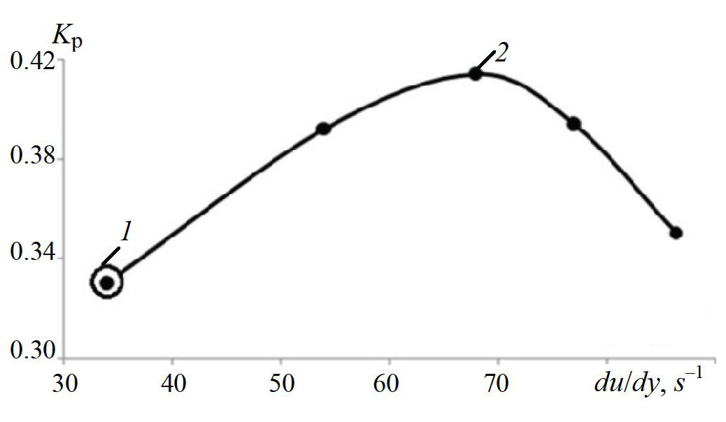 The findings on the impact of the intensity of momentum action on the efficiency of particle separation by density in the gravity flow are presented in Fig. 9 in the form of a dependence of the separation coefficient (8) on the shear rate. The technique for determining the average shear rate and separation coefficient was similar to the technique used in the case of differences in particle size. For a comparative assessment of the effect of momentum action in the separation process, the dependence Ks(du/dy) was constructed taking into account the separation coefficient and the average value of the shear rate in the gravity flow without momentum action. These indicators are determined in full accordance with the procedure used to find them in the gravity flow of particles of various sizes (Fig. 4).