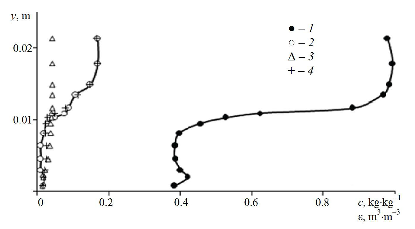 Fig. 10. Profiles of the volume fraction of voids (1) and the concentration of silica gel granules (2) – (4) in the activated (belt speed 1.5 m×s–1) fast gravity flow in a mixture with beads: 1, 2 – experimental results; 3 – simulation results based on (1) at Dm = 0; K ≠ 0; 4 – simulation results based on (1) at Dm ≠ 0, K ≠ 0