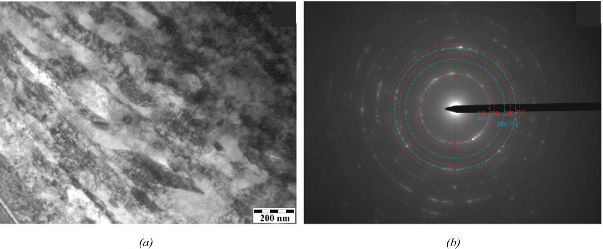 Fig. 3. Near-surface layer’s structure of AISI 321 stainless steel after UNSM with N = 9367 mm–2 processing density (specimen #1): (a) is TEM bright-field image of a cross-section parallel to the processing direction; (b) is the corresponding micro diffraction pattern with the reflections of a¢- and g-phases