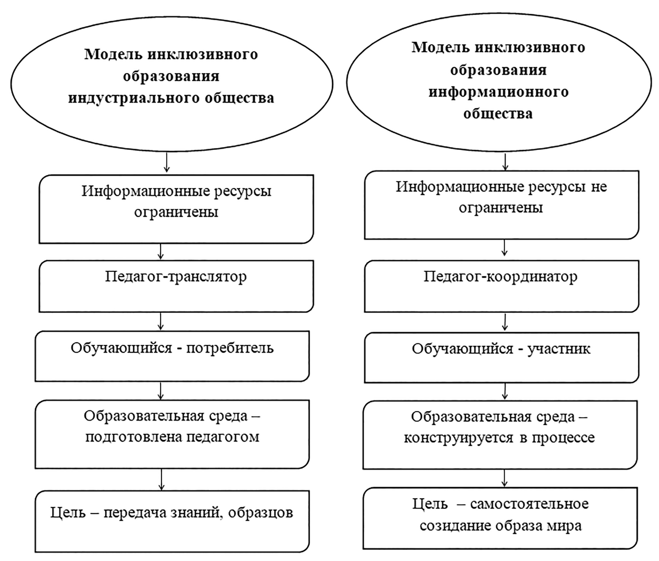 В связи с этим следует отметить и изменения при переходе от индустриальной к информационной системе образования. Более наглядно данное сравнение можно представить в виде рисунка (см. рис. 1).