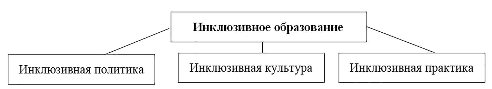 Согласно трёхмерной модели, инклюзивное образование включает следующие равнозначные компоненты: инклюзивную культуру, инклюзивную политику, инклюзивную практику (см. рис. 2).