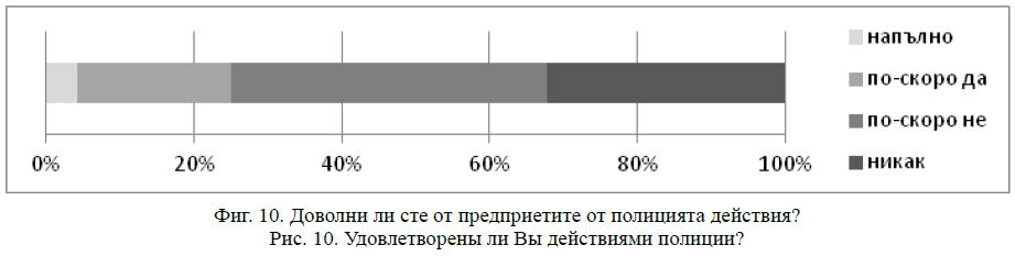 напълно и 20,8 % – частично. Мнозинството изразяват недоволство – никак не са доволни от действията на полицията 32,2 %, а по-скоро недоволни са 42,7 % (фиг. 10).