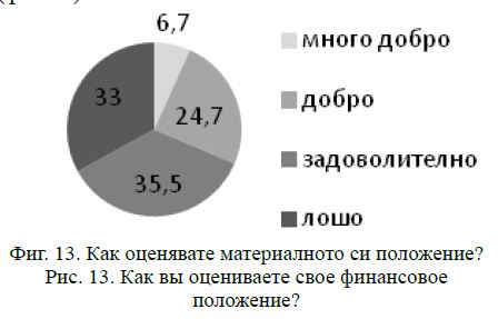 И настоящото изследване извежда на първо място сред проблемите в обществото ни бедността. Тя е много тежък проблем според 52 % от анкетираните, а тежък, според още 31 %. За повече от една четвърт (27,3 %) именно ниският доход е най-голям личен проблем. Самите респонденти оценяват материалното положение на домакинствата си най-често като задоволително и лошо (фиг. 13).