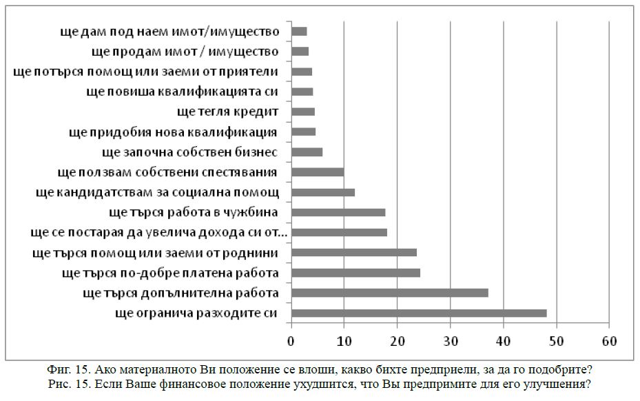 Изследването показва много широко разпространени нагласи за прилагане на пасивни стратегии за справяне. Най-много – 47,2 % декларират, че ще ограничат разходите си. Някакви форми на активни стратегии са застъпени в около половината отговори. Показателно обаче е, че само под 4 % от отговорите включват повишаване на квалификацията или придобиване на нова квалификация. И докато това са намерения за една хипотетична ситуация, то вече реално правеното за повишаване на доходите потвърждава вече очертаната картина. При положение, че две трети оценяват материалното си положение като лошо и задоволително и само 1,7 % казват, че нямат нужда да увеличат дохода си, то 58,5 % не правят нищо, за да го постигнат. По около 12 % поддържат домашно стопанство и без регистрация извършват услуги срещу заплащане (т.е. сива икономика). Почти 10 % работят допълнително без трудов договор, по около 5 % работят допълнително при същия или друг работодател с договори. Само 3,3 % имат допълнителен собствен бизнес. Изводът, който се налага е, че активност почти липсва, а доколкото я има, тя се реализира в не малка степен в някаква форма на скрита икономика.