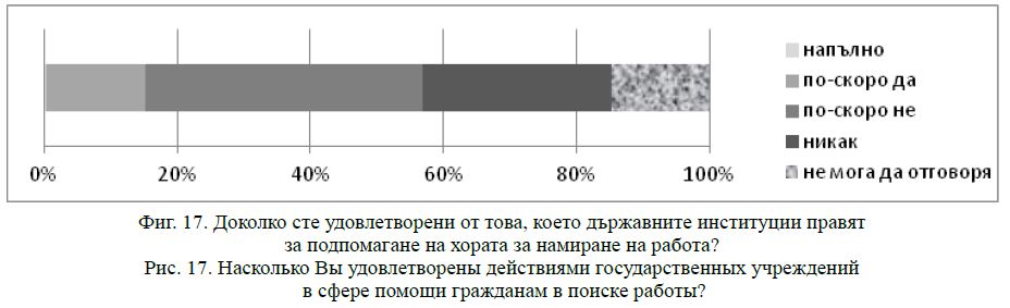 изцяло недоволни са 18,4 %. Съпоставката на отговорите за удовлетвореността от оказаните услуги и за ориентацията към определени субекти за такава услуга показва, че явно по неформални канали тече информация и тя насочва хората към кого да се обърнат за помощ при търсене на работа. Същевременно е видно и че държавните бюра по труда трябва сериозно да променят работата си, за да бъдат не просто административни структури със статистически функции, а да изпълняват успешно задачите, за които са създадени.