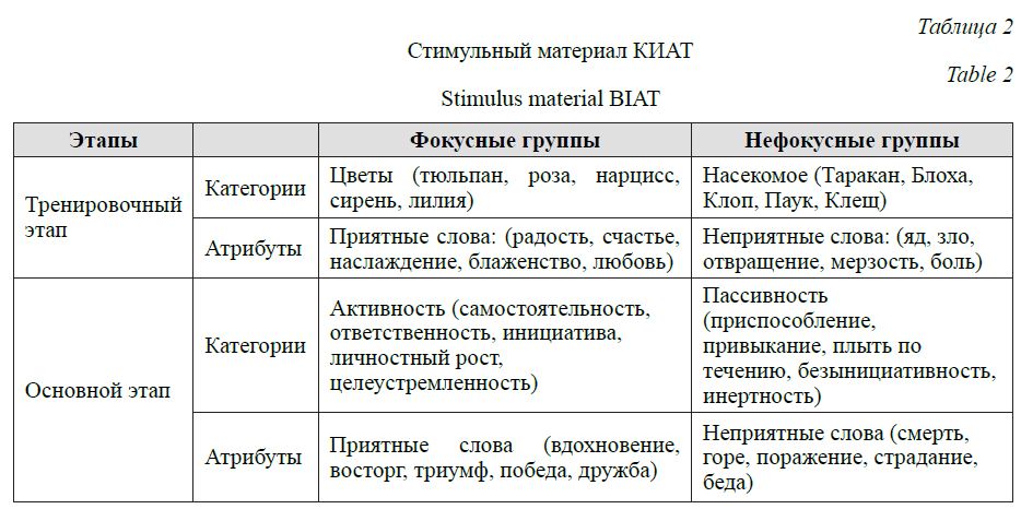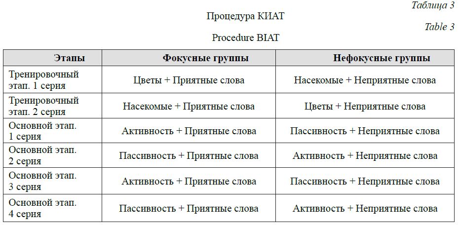 Краткий имплицитный ассоциативный тест (КИАТ) состоял из двух частей: тренировочной, необходимой для освоения участниками процедуры исследования, и основной, предназначенной для оценки неявных (имплицитных) установок.