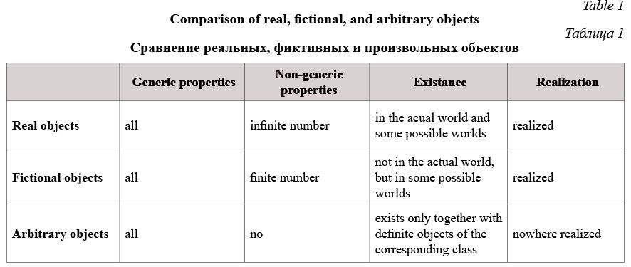 Arbitrary, fictional and real objects can, using the apparatus of the semantics of possible worlds, be compared also by which possible worlds they exist in and how those objects are realised. It should be clarified that possible worlds are understood here not just as parts of a model, but in a broader metaphysical sense (whatever it may be). Thus, (1) real objects necessarily exist in the actual world and can exist in an indefinite set of possible worlds (this indefinite set of worlds is half of the whole set of possible worlds, since an object in a possible world either exists or does not exist); (2) fictional objects do not exist in the actual world, but exist in an indefinite set of merely possible worlds (fictional objects also exist in half of all possible worlds and do not exist in the other half of them); (3) arbitrary objects exist in any possible worlds where there is at least one definite object of the corresponding class, but no arbitrary object in any possible world is any definite object (it does not take the ‘value’ of any definite object), since for arbitrary objects the essential modality is the afthairetic modality, according to which an arbitrary object in some situation can be some definite object, but at the same time it is not actually a definite object in any situation, an arbitrary object always remains arbitrary.