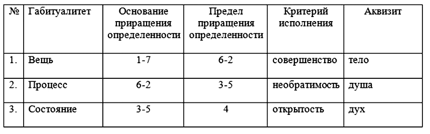 IV. Модель семиотического треугольника преобразуется в трехслойное образование с границами, параллельными основанию. Между ними заключены разнородные в качественном смысле предметно-содержательные пласты. К аналогичному приему прибегал Ф.В.Й. Шеллинг в «Системе трансцендентального идеализма», трактуя их как различные «эпохи» самосознания. В данном случае следует ограничиться различиями в габитуалитетах предметности, образующей условные семиотические слои. Это будут: вещь, процесс и состояние (см. табл. 1).
