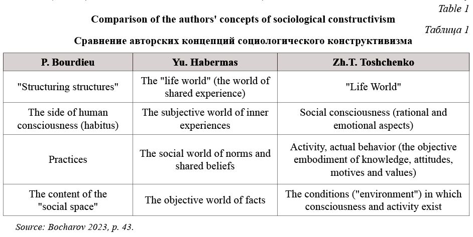 Synthetic approaches. Currently, the "new working class studies" approach is most common in Western literature. According to this approach, the class conflict nature of labor relations is considered, affecting the culture and interests of the actors in these relations (Linkon, Russo 2016), i.e., neo-Marxist and cultural approaches are synthesized, but taking into account the emotional component of labor behavior (Gavrilyuk 2021). In Russian sociology, this approach (along with the resource approach) is close to the constructivist concept of the sociology of life developed by Zh.T. Toschenko (Toschenko 2000; Toshchenko 2016). It is important to note that, in general, constructivist theories carry out a kind of synthesis of understanding the objectively existing social structure (institutions) and the activities of subjects. This is what helps to overcome the critical shortcomings of the concepts of sociological realism and nominalism. It is necessary to emphasize a certain general similarity of the concept of sociology of life by Zh.T. Toshchenko with the theories of P. Bourdieu and Yu. Habermas (Table 1).