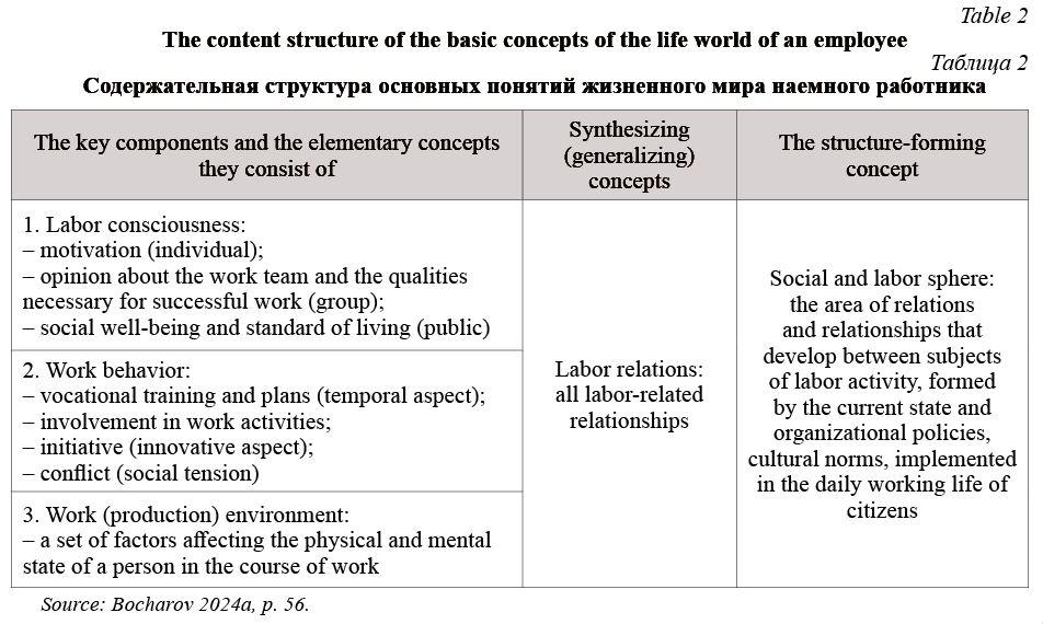 The key components of the life world of employees are: work consciousness, work behavior and the work (production) environment (understood as a set of factors affecting the physical and mental state of a person in the course of work). At the same time, the main elementary concepts that are necessarily included in the subject field of labor sociology are the following: "motivation of labor", "involvement in the organization", "social well-being", "social tension". It should be noted that each of these concepts within the framework of the Samara school of Labor Sociology, in addition to theoretical interpretation, has a measurement methodology based on empirical data from mass questionnaires (Avdoshina, Bocharov, Vaskina 2024; Bocharov 2024a):