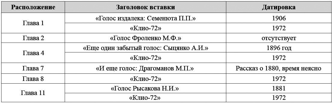 и «Клио–72». В них меняется повествователь, время повествования датируется 1906 и 1972 годом соответственно, а время изображения выходит за рамки фабулы романа. Аналогичные вставки находим и в некоторых других главах. Их полный перечень приведен в виде таблицы (табл. 1).