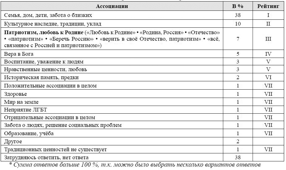 Отметим, при более пристальном рассмотрении традиционные ценности относятся к общим нравственным ориентирам, а традиционные духовно-нравственные ценности – к конкретным духовно-нравственным аспектам, таким как семейные ценности, патриотизм, приоритет духовного над материальным и другие. Вместе с этим в эмпирической части данной работы считаем возможным использовать эти понятия как взаимозаменяемые, поскольку речь идет именно о традиционных духовно-нравственных ценностях, являющихся традиционными для российского общества.