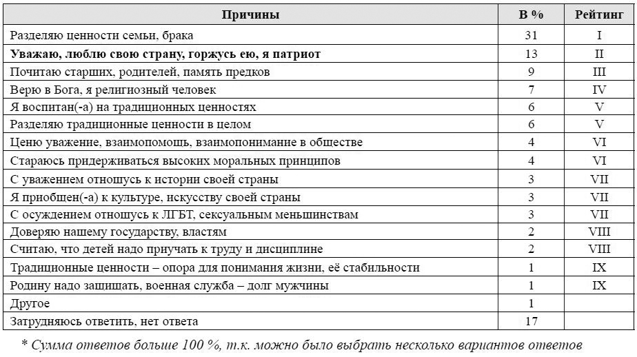 Тем, кто считает себя приверженцами традиционных ценностей (85 %), задавался вопрос о причинах отнесения себя к приверженцам традиционных ценностей (табл. 2).