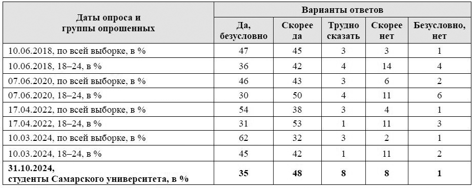 Патриотизм, по итогам вторичного анализа данных ВЦИОМ и ФОМ, входит в число наиболее важных традиционных ценностей россиян. Полученные результаты о характеристике респондентами себя как патриота или не патриота по всей выборке, в группе молодежи и среди студентов Самарского университета свидетельствуют о том, что среди молодежи меньше, чем по всей выборке, тех, кто считает себя безусловным патриотом. Это позволяет говорить о том, что необходимо усиливать работу тем субъектам, чья деятельность так или иначе связана с молодежью и патриотическим воспитанием именно в этой возрастной группе. Причем среди студентов Самарского университета безусловных патриотов еще меньше, чем среди молодежи России, что, скорее всего, объясняется спецификой студенчества как более критичной группы молодежи в отличие от других групп, таких как работающая, безработная и служащая в армии молодежь. Соответственно, важно в выстраивании социальной, молодежной политики особое внимание уделять патриотическому воспитанию именно в отношении такой группы молодежи, как студенчество. Полученные в Самарском университете данные подтверждают этот тезис и позволяют выделить группы, которые заслуживают особого внимания со стороны ответственных за воспитательную работу в вузе в плане патриотического воспитания: это старшие курсы, студенты социально-гуманитарного института и института информатики и кибернетики.