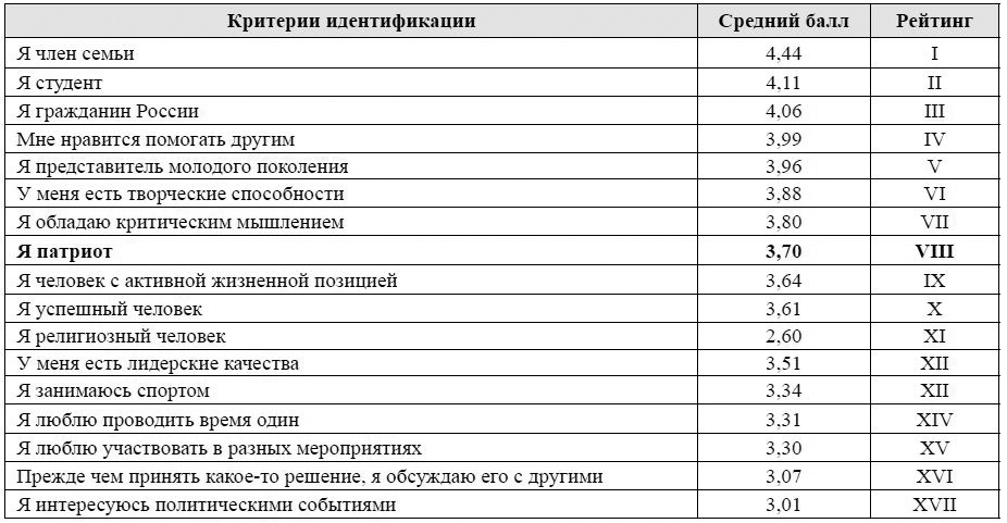 Патриотизм у студентов Самарского университета находится в середине списка критериев самоидентификации. Отметим, что 1–3, 5 позиции представляют собой «объективные» критерии самоидентификации. Среди «субъективных» критериев патриотизм находится после желания помогать другим, наличия творческих способностей и критического мышления (табл. 5).