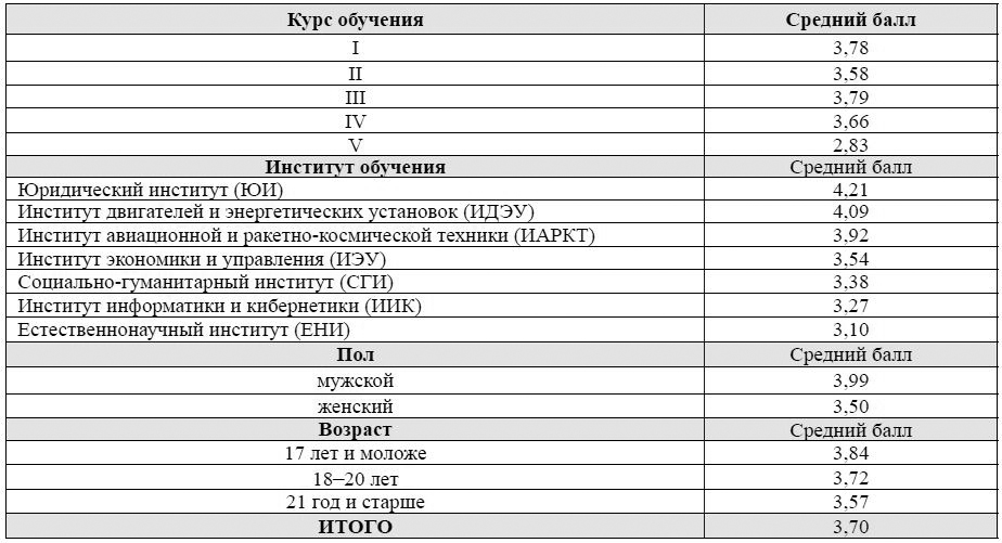 Среди студентов с 1 по 4 курс степень выраженности патриотизма выше, чем у студентов 5 курса. Самая высокая степень выраженности патриотизма в Самарском университете у обучающихся юридического института (4,21), а самая низкая – естественнонаучного института (3,10). Среди юношей степень выраженности патриотизма несколько выше (3,99), чем у девушек (3,50). У более молодых студентов степень выраженности патриотизма выше, чем у старших обучающихся.