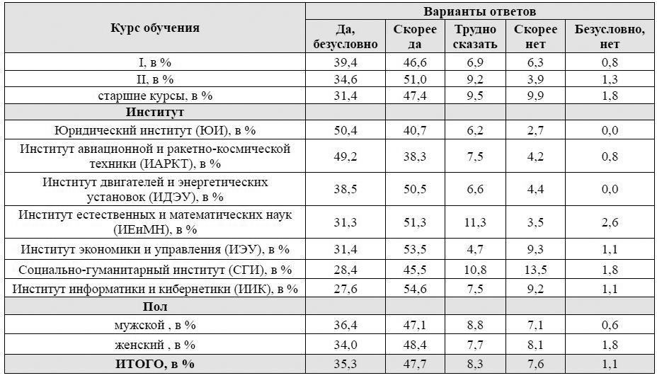 Безусловных патриотов больше на первом курсе, чем на старших курсах. Таковых больше среди студентов юридического института (50,4 %),
