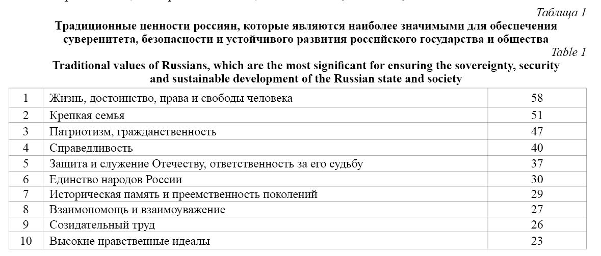 (30 %), «справедливость» (28 %), «закон» (26 %) и только на 11-м месте «созидание» и «нравственность» (по 10 %). Не менее важна оценка традиционных ценностей россиян, которые являются наиболее значимыми для обеспечения суверенитета, безопасности и устойчивого развития российского государства и общества. Приведем первые 10 позиций (см. табл. 1).