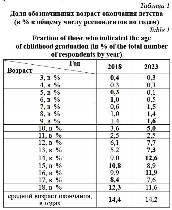 Прежде всего поясним, что речь идет именно о субъективной оценке самими респондентами возраста окончания детства (табл. 1).