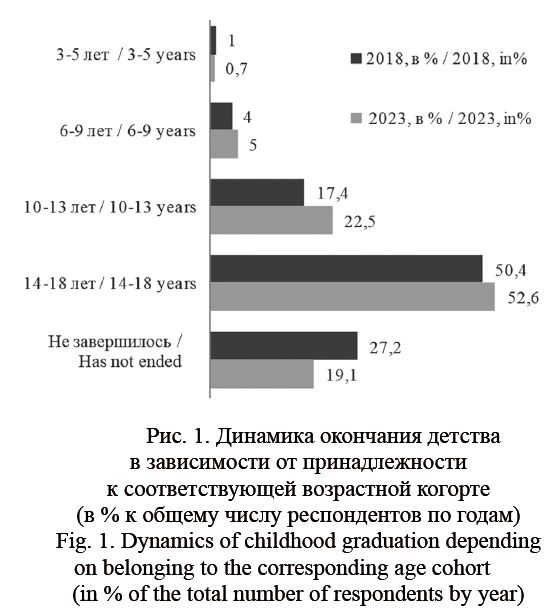 специфических компетенций, которые либо вообще отсутствовали у предыдущих поколений, либо они осваивали их гораздо позже, что также отмечают ученые (например, Лишаев 2016; Майорова-Щеглова, Колосова, Губанова 2020). Данная работа является развитием некоторых положений и идей этой дискуссии, однако в ней поставлена и реализована новая цель: описать треки эмпирического анализа на основе субъективного определения молодыми верхней границы детства, провести сравнительный анализ результатов 2018 и 2023 годов по вопросу окончания детства.