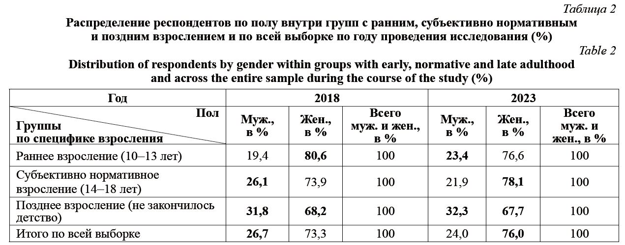 В табл. 2 шрифтом отмечен наибольший процент по полу в группах с ранним, субъективно нормативным и поздним взрослением по годам. В группе с ранним взрослением мальчиков в 2023 г. больше, чем мальчиков в 2018 г., в то время как девочек больше в 2018 г. по сравнению с девочками 2023 г. В группе с субъективно нормативным взрослением мальчиков в 2018 г. больше, чем мальчиков в 2023 г. Девочек больше в этой группе в 2023 г.