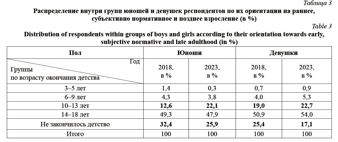 Если в 2018 г. больше девушек (19 %), отметивших, что детство завершилось в интервале от 10 до 13 лет, чем юношей (12,6 %), то в 2023 г. примерно одинаковый процент юношей и девушек отметили, что детство завершилось в этом интервале. Юношей, ориентированных на позднее взросление, больше, чем девушек, как в 2018 г., так и в 2023 г. Что позволяет сделать вывод, что юноши больше ориентированы на позднее взросление, чем девушки (табл. 3).