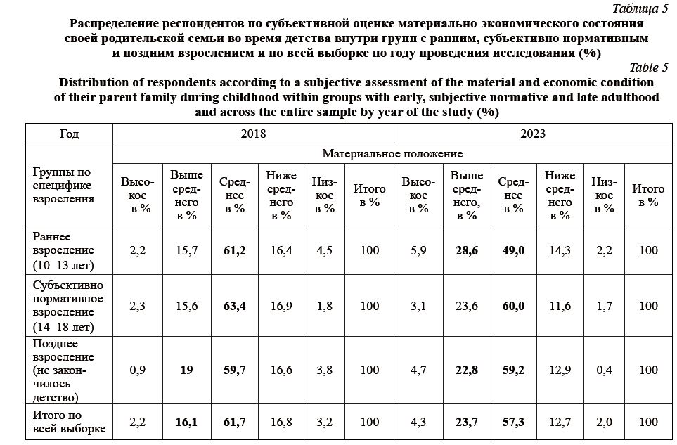 Рассмотрим, как внутри групп с ранним, субъективно нормативным и поздним взрослением респонденты распределяются по оценке материального положения своей семьи в детстве (табл. 5).