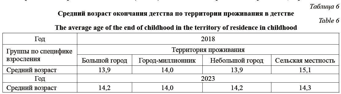 Немного повысился средний возраст окончания детства тех, кто проживает в больших и небольших городах, но при этом существенно снизился средний возраст окончания детства тех, кто проживает в сельской местности в 2023 году по сравнению с 2018 годом. Возможно, это связано с происходящими событиями в стране и мире, которые наиболее остро ощутили на себе сельские жители и дети в том числе.