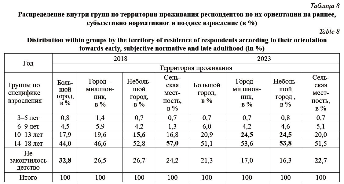 13 лет, по сравнению с юношами 2018 г. выше, и в то же время доля юношей в 2023, считающих, что детство еще продолжаетс, ниже, чем в 2018 г., но все равно достаточно высокая, что подтверждает идею парадоксальности одновременно раннего и позднего взросления, прежде всего, применительно к юношам. По всем группам респондентов с ранним, субъективно нормативным и поздним взрослением отмечаем, что повысилась к 2023 году доля тех, кто отметил материальное положение во время их детства как высокое и выше среднего, и понизился процент тех, кто фиксировал свое материальное положение в детстве как низкое и ниже среднего. Немного повысился средний возраст окончания детства тех, кто проживает в больших и небольших городах, но при этом существенно снизился средний возраст окончания детства тех, кто проживает в сельской местности в 2023 году по сравнению с 2018 годом. В 2023 году по всем территориям тех, чье детство подошло к концу в интервале от 10 до 13 лет, выше, чем в 2018 г., в то время как тех, у кого детство не завершилось, ниже.