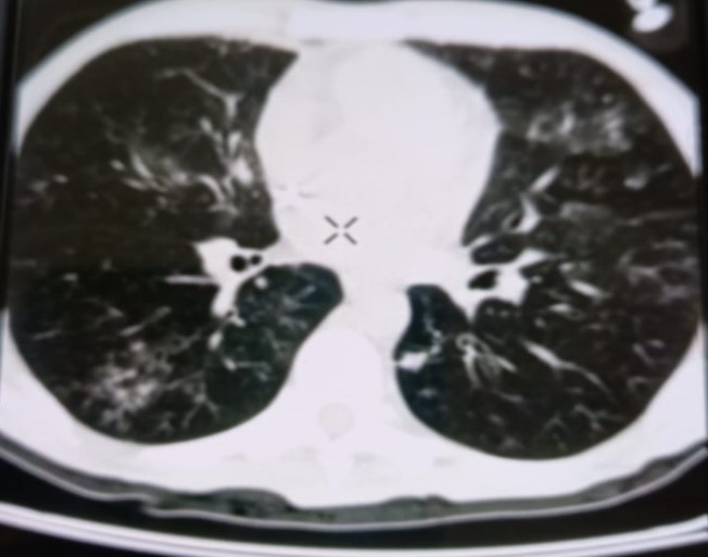 Учитывая на подозрительные в отношении туберкулеза легких КТ-признаки, пациенту впервые проведена метод ПЦР-диагностики выявления ДНК микобактерий туберкулеза, который показал положительный результат, что позволило установить диагноз «Диссеминированный туберкулез легких, двусторонний. КУМ «-» в сочетании с коронавирусной инфекцией COVID-19 средней степени тяжести, пневмоцистной пневмонией и бактериальной пневмонией» у пациента с ВИЧ-инфекцией 4В стадии. Для дальнейшей терапии пациент был переведен в стационар туберкулезного профиля.