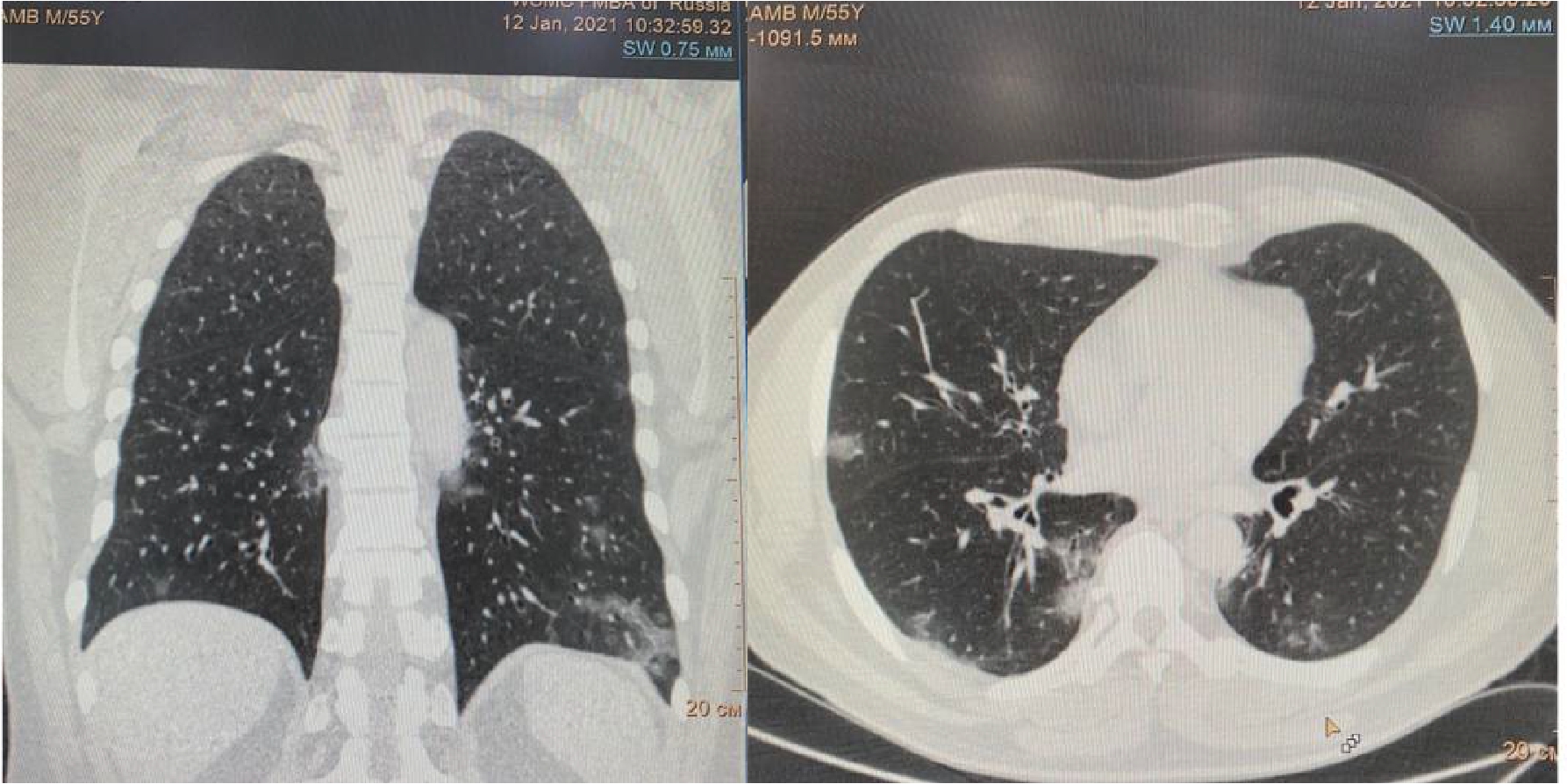 Пациент (мужчина) 55 лет поступил в стационар с жалобами на сухой кашель, нарушения обоняния и вкуса, одышку при нагрузке, ощущение тяжести в грудной клетке, слабость, боли в мышцах и повышение температуры тела до 380 С. Больной обратился за медицинской помощью на 5 сутки после появления симптомов ОРЗ в связи с неэффективностью самостоятельного лечения и появлением одышки. При поступлении по данным МСКТ легких – признаки двусторонней полисегментарной интерстициальной пневмонии с объемом изменений в пределах 20%, КТ-1 (рис.1). Короновирусная инфекция была подтверждена результатами ПЦР. При поступлении состояние было расценено как средне-тяжелое.