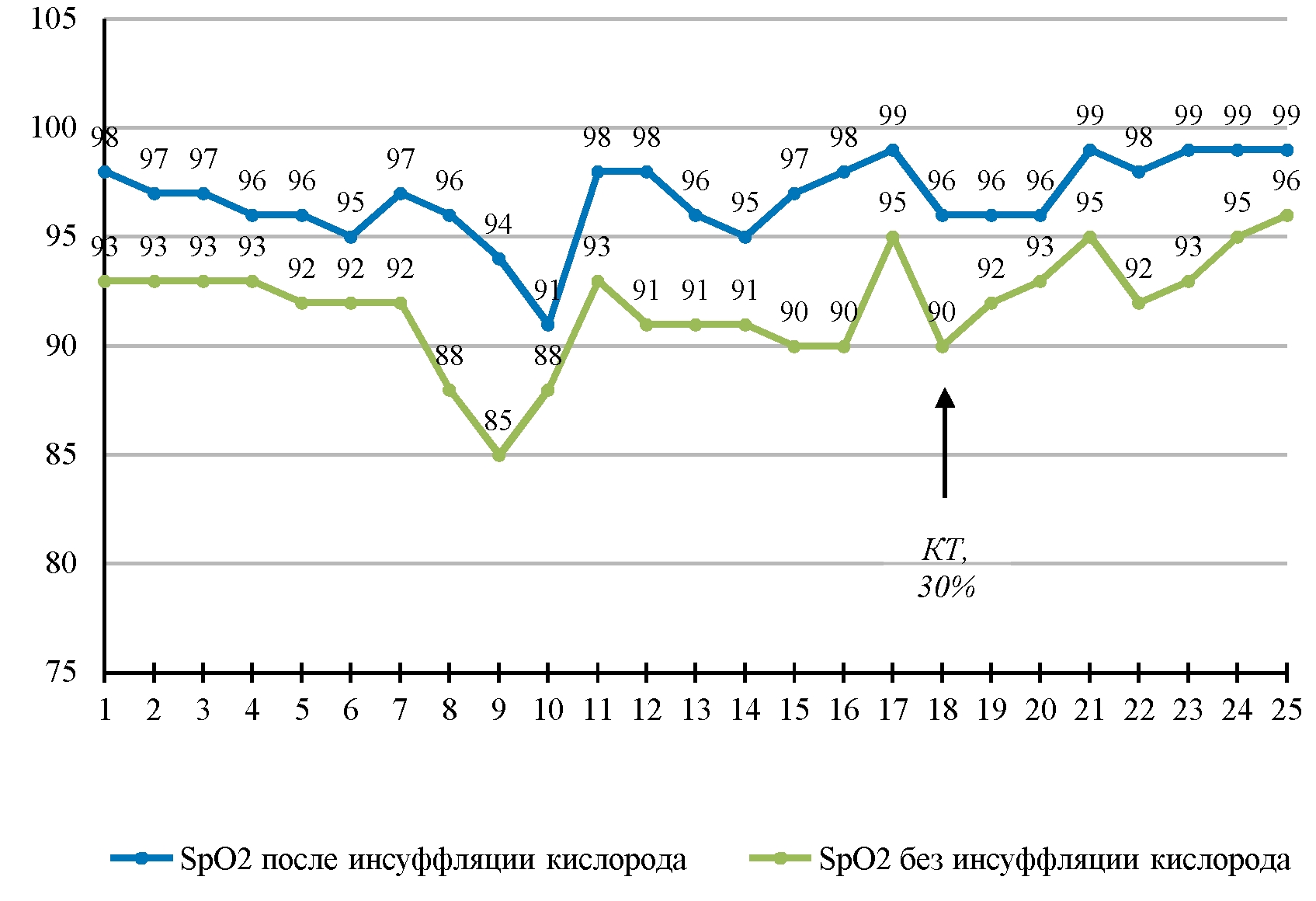 Рисунок 5. Динамика показателей SpO2, %