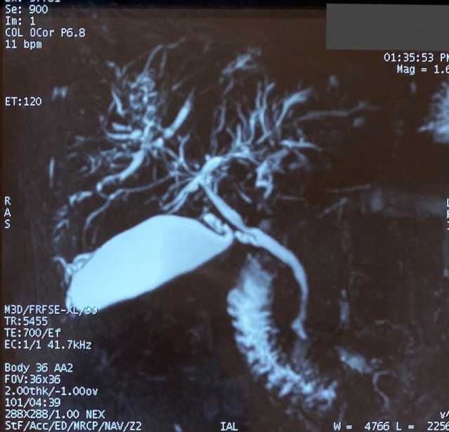 С учетом выявленных изменений по данным эластометрии и наличии повышенного уровня ГГТП пациентка направлена на магнитно-резонансную холангиопанкреатографию (МРХПГ) для дополнительного поиска причин синдрома холестаза.