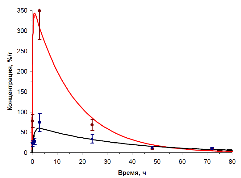 В качестве примера на рис. 2 приведены рассчитанные в результате моделирования фармакокинетические кривые (3) для камеры ЩЖ интактных мышей с использованием 188Re-МСА (чёрный цвет) и Na188ReO4 (красный цвет). Также на рис. 2 квадратиками и кружочками соответственно показаны экспериментальные значения с учётом их погрешности [4]. Можно видеть, что полученные модельные фармакокинетические кривые хорошо согласуются со своими экспериментальными значениями.
