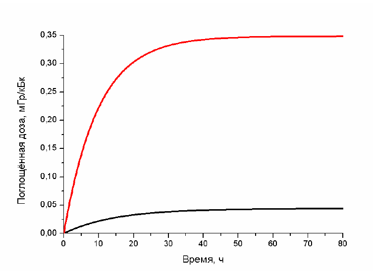 С использованием данных табл. 1 по формулам (9) рассчитывались накопленные и полные ПД в органах и тканях для 188Re-МСА и Na188ReO4. В качестве примера на рис. 3 приведена динамика формирования накопленных поглощённых доз в крови интактных мышей с использованием 188Re-МСА (чёрный цвет) и Na188ReO4 (красный цвет). Значения ПД монотонно возрастают со временем, достигая своих предельных значений равных полным ПД примерно к 80 часам от начала введения РФЛП в кровь. При этом, как и следовало ожидать, значения ПД в крови от 188Re-МСА существенно меньше по сравнению с Na188ReO4, что обусловлено большим различием значений клиренса крови этих РФЛП. Полученные в других камерах модели зависимости накопленных ПД аналогичны, однако значения самих ПД в разных органах и тканях при использовании двух исследуемых РФЛП существенно различаются.