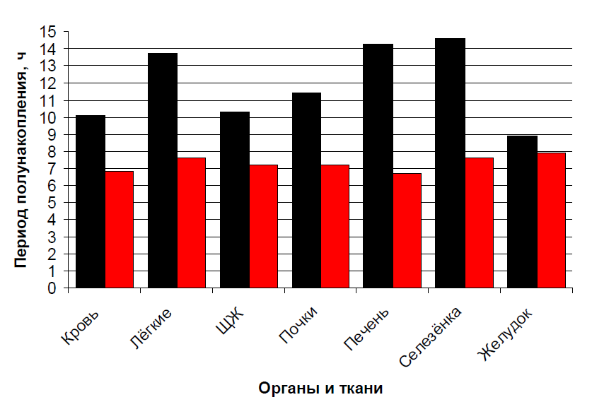 Печень | 3 ч 5 мин | 12,70 ± 0,55 5,44 ± 0,32 | 12,21 3,92 | 1,54 (11,0) 55,5 (12,0) | 0,008 0,063 | 89,6 11,1 | 14,3 6,7 |
