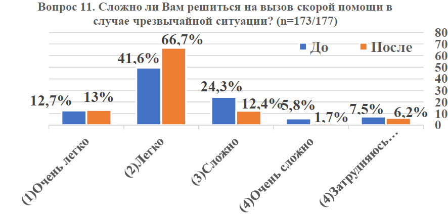 При сравнении результатов исследования в ответах на вопрос №11 о готовности респондентов на вызов скорой медицинской помощи в случае чрезвычайной ситуации «до» и «после» применения инфографики, получены статистически значимые (р<0,05) различия: увеличение количества ответивших на этот вопрос «легко» (χ2=10,35; р=0,00), а также уменьшение количества ответивших на этот вопрос «сложно» (χ2=7,53; р=0,01) и «очень сложно» (χ2=4,08; р=0,04) (рис.3).