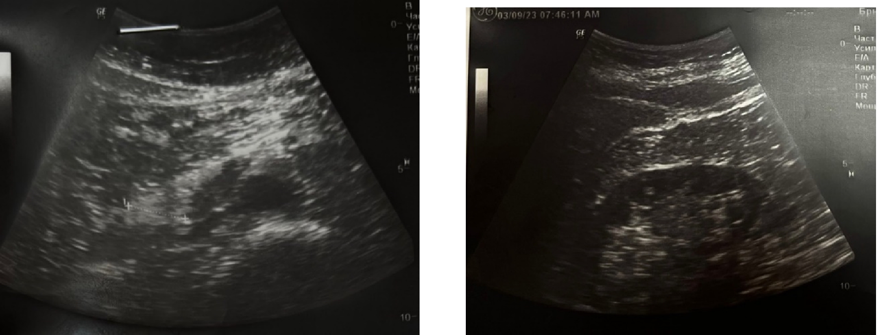 Рис. 1. Диффузные изменения паренхимы почек. Двухсторонний нефроптоз