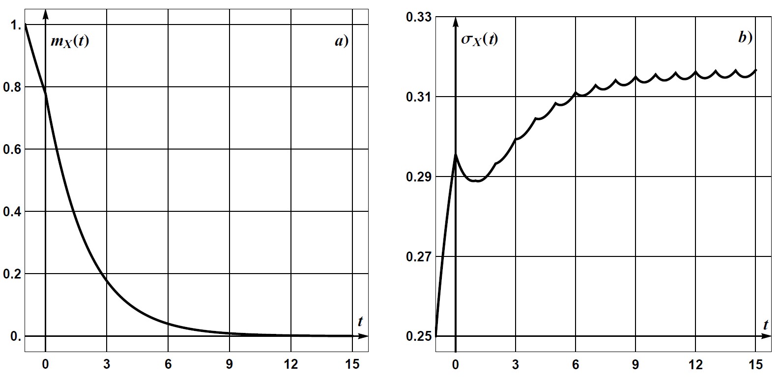 Несложно увидеть, что вследствие линейности уравнений (7) для любого , k = 0, 1,..., N, структуры ОДУ для последовательности векторов функций математического ожидания и матриц функций ковариации будут иметь вид: