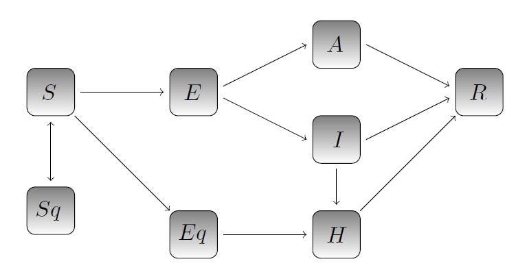 что позволяет получить нелинейную систему алгебраических уравнений, которая затем решается численно с помощью метода коллокации. В этой статье рассматривается модель SEAIR (susceptible exposed infected asymptomatically infected recovered: восприимчивые инфицированные бессимптомные инфицированные выздоровевшие).