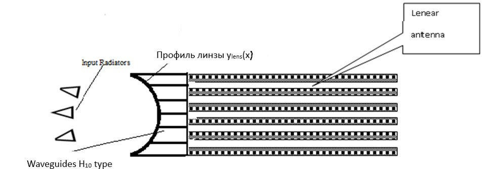 В распределительном устройстве использована линза с вынужденным распространением, выполненная на основе прямоугольных волноводов с волной H10. Профиль бифокальной линзы ylens(x)- эллипс. Конструкция линзы должна обеспечивать равенство электрических длин путей