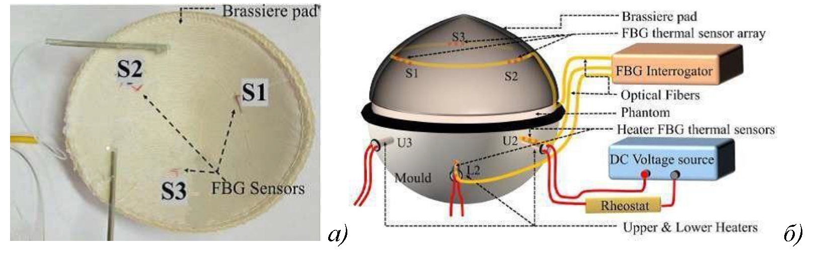Основное усилие исследования в [1] направлено на разработку простого, удобного и точного метода диагностики рака груди. Метод основан на использовании массива ВБР датчиков, который фиксирует изменения температуры на поверхности груди. Авторы использовали модель груди, изготовленную из агарового геля, в которую встроили нагреватели, имитирующие очаги опухоли. Проверка эффективности метода с была проведена при помощи экспериментального исследования. Было показано, что что температурный перепад более, чем 0.3°C может быть надёжным индикатором наличия опухоли в ткани.