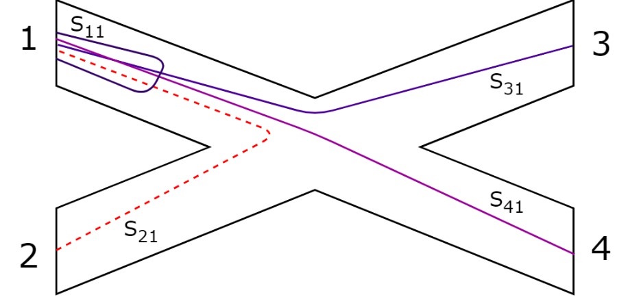 Определение элементов S-матрицы. Суть Sik элемента матрицы определяется как коэффициент передачи сигнала из k-го порта устройства в i-ый. В общем виде, передача сигнала происходит как с изменением амплитуды, так и с фазовой задержкой, и, в общем случае, элементы матрицы рассеяния комплексные.