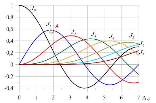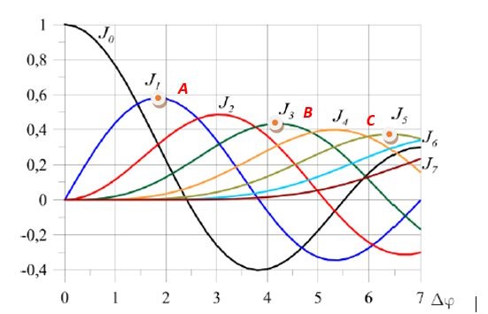 При работе в MITB модуляционной характеристики (1) спектр излучения  на выходе ШАММЦ содержит n трехчастотных групп в двух полосах. Амплитуда составляющих в этих группах может быть вычислена по известным табличным или графическим (рис. 2) данным для функций Бесселя первого рода n-х порядков.