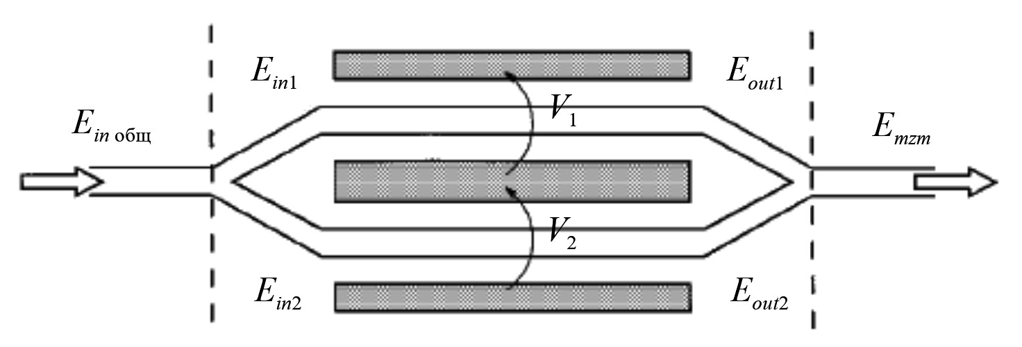 где Δφ1(t) и Δφ2(t) – фазовые сдвиги в первом и втором портах (плечах) модулятора; Ein – амплитуда входного оптического сигнала. Фазовые сдвиги определяются воздействием модулирующих сигналов Vi(t) и заданными РТ для обоих плеч ДПММЦ (i = 1, 2номер порта (плеча) модулятора):