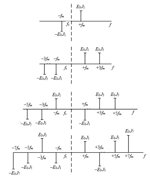 Из (10) видно, что несущая частота fc подавлена, а излучение состоит из двух симметричных полос с нечетными гармоническими составляющими радиочастоты - fc+(2k+1)fm и fc(2k+1)fm.